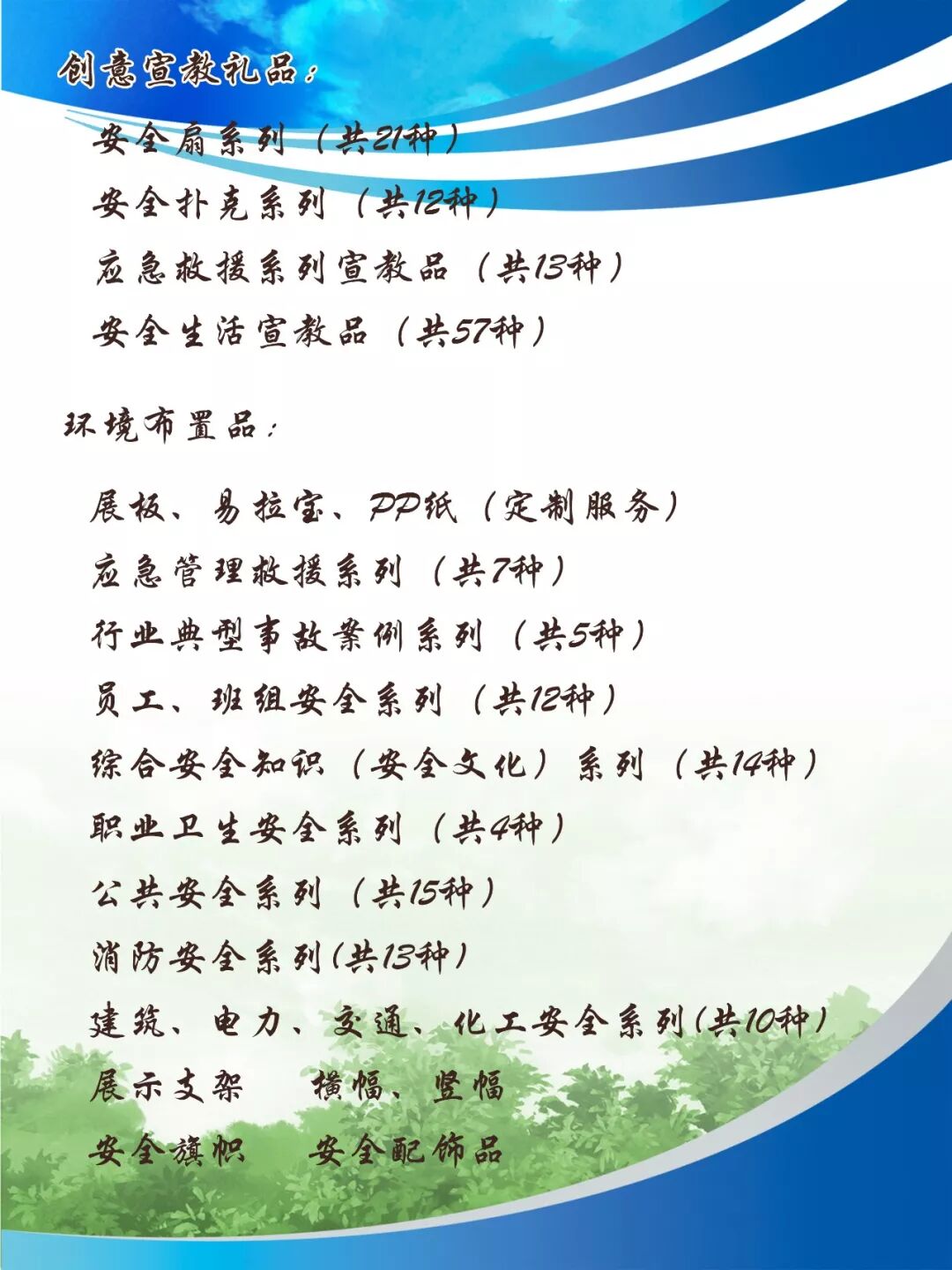 为方便广大企业,我们提供了安全生产月宣传品目录,欢迎企业选择购买。